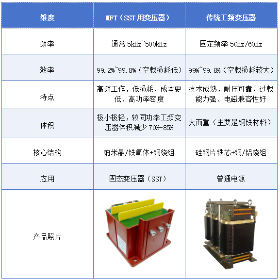 与传统工频变压器相比,其核心优势源于“高频工作”带来的体积、效率、响应速度突破,完美契合SST的小型化、高效化、智能化需求。
